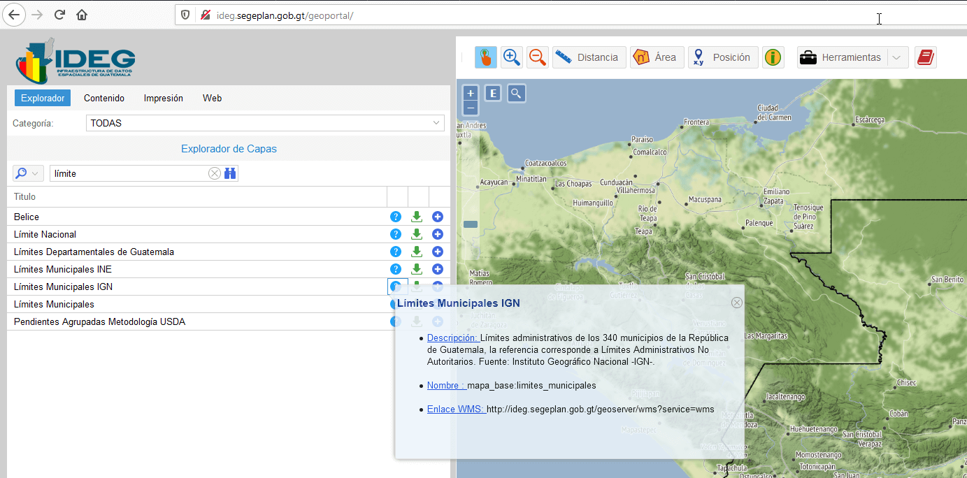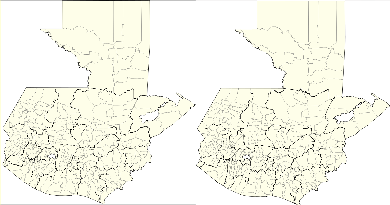 Ésta fue la parte más difícil para mi, dada mi ignorancia cartográfica. Se de los SVG pero al buscar por un mapa de mi país con bordes de municipios en este formato no lo pude encontrar. Terminé llegando a este sitio y ahí encontré el mapa llamado “Límites Municipales IGN” que cuenta con los 340 municipios y “Límites Departamentales de Guatemala”. Ambos se descargan en formato geoJSON.