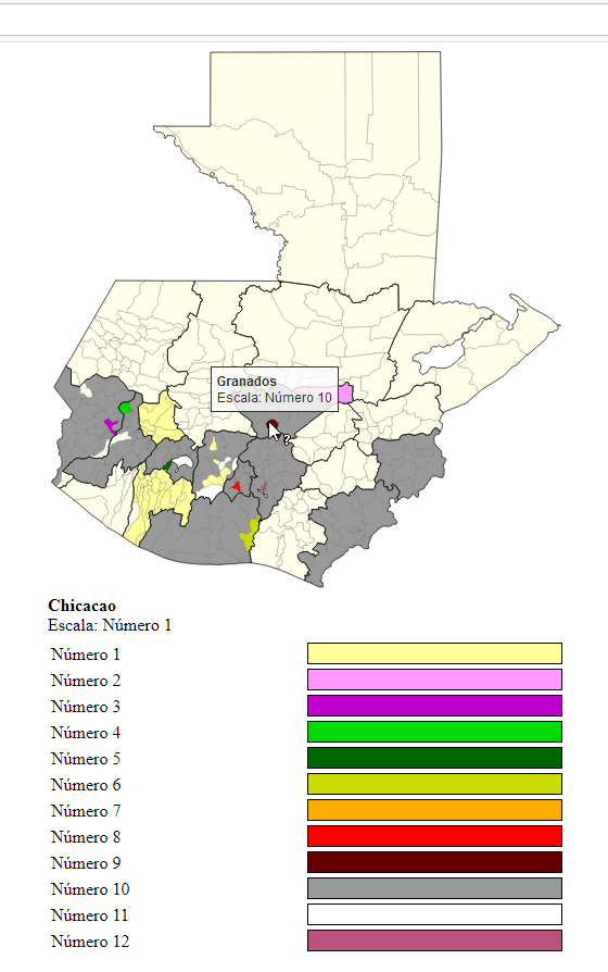 Lo que el mapa tenía que mostrar eran tres datos por cada municipio del país al momento de pasar por encima el puntero del mouse o hacer click. Además de colorear, según una escala, cada municipio dependiendo el valor de uno de los datos.